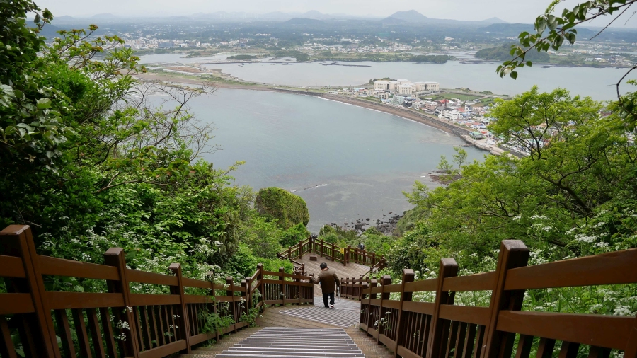Po prohlídce jeskyně jsem se vrátil na zastávku na hlavní cestě po obvodu ostrova, počkal opět na autobus 201 a pokračoval dále na východ ostrova na Seongsan Ilchulbong, pseudoostrov, resp. poloostrov s nádhernými scenériemi a 180metrovým převýšením.