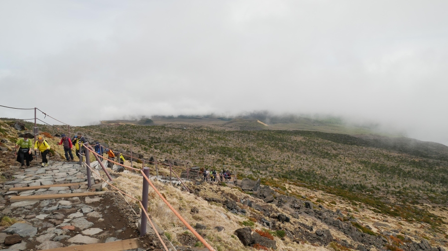 Na vrcholu Hallasanu nejsou stromy, takže nad 1500 metrů nad mořem by byl hezký výhled do kraje, kdyby nebylo oblačno. Aspoň že tedy nepršelo. Blízké okolí vidět sice bylo dobře, ale na pobřeží jsem nedohlédl, to bylo pod mraky.