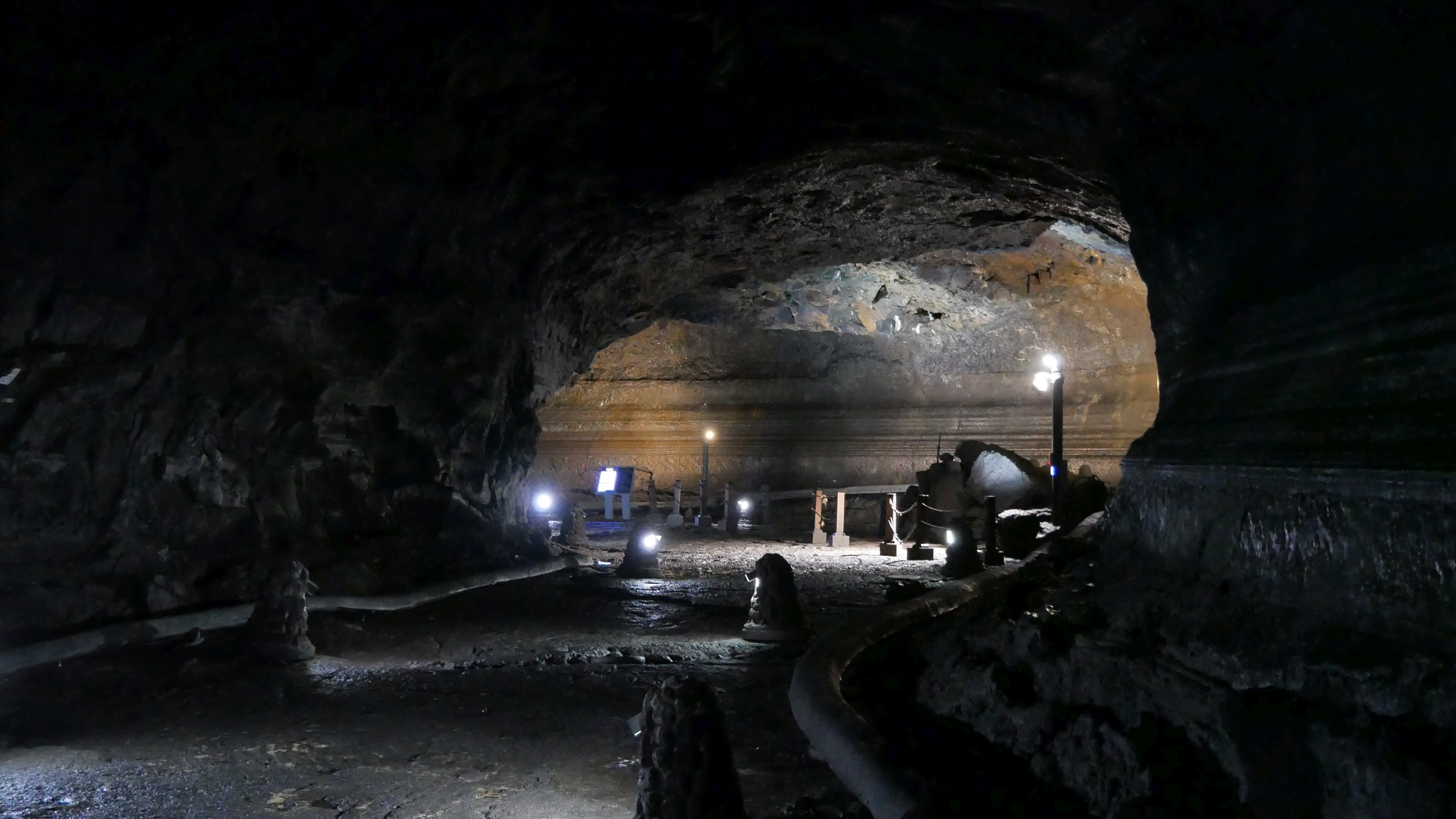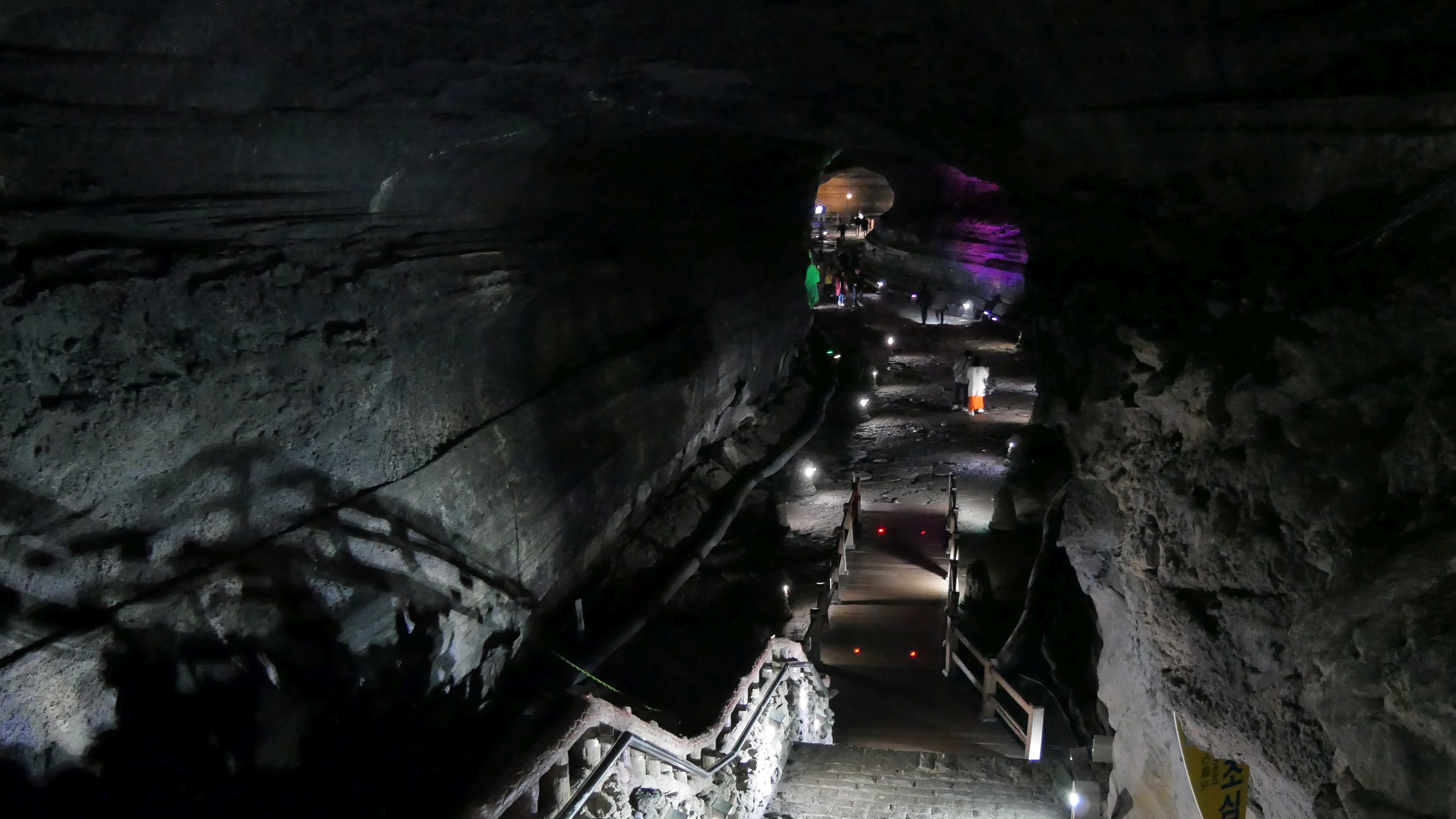U Manjanggul jeskyně v poledne nebyl skoro nikdo, davy přišly až kolem druhé, když jsem odcházel. Jeskyně je vlastně lávový tunel, kudy tekla před tisíci lety při sopečné a vulkanické aktivitě na ostrově láva. Dohromady má asi kolem 8 kilometrů, zpřístupněný je jeden. Ale i tak to stačí a je to opravdu zážitek – tunel ze ztuhlé lávy, různě úzké a široké části, římsy, krápníky, závaly, rafty, další speciální útvary. A na konci je největší ztuhlý lávopád na světě. Ona celá lávová jeskyně je asi největší a nejrozlehlejší na světě, proto je na seznamu UNESCO.